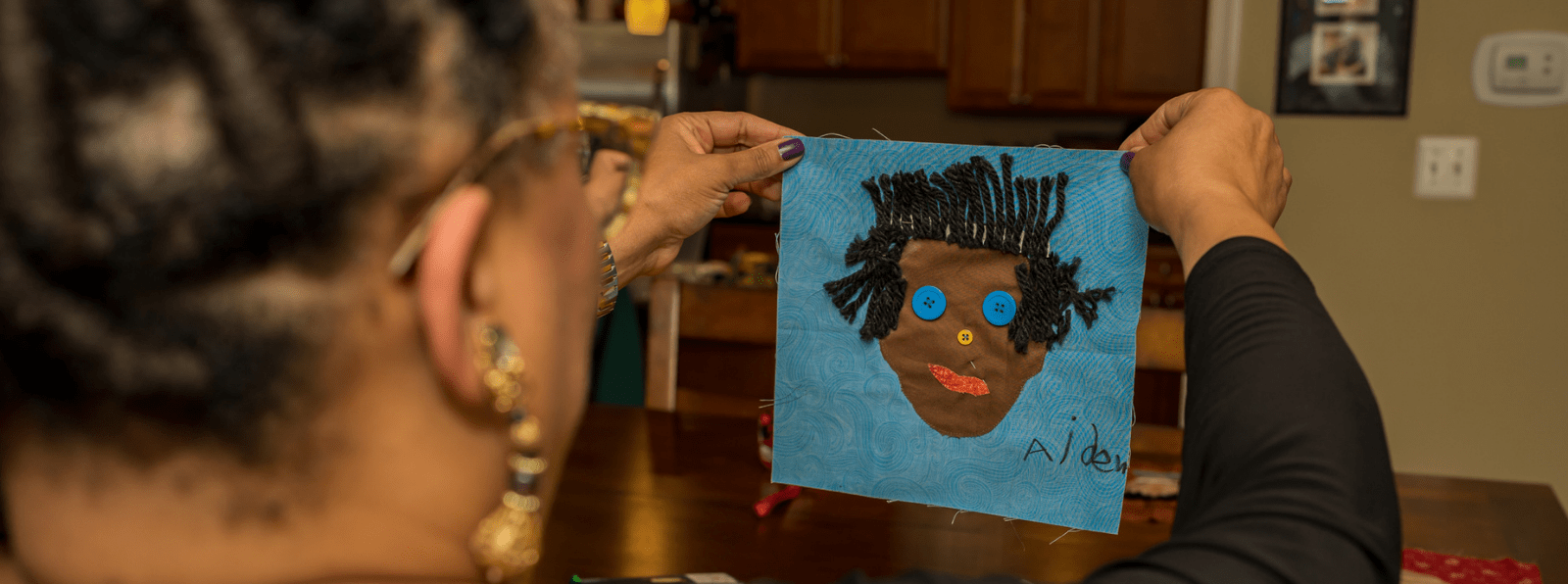 A person holding up a collage portrait labeled “Aiden.”